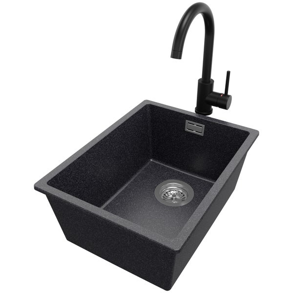 PRIMAGRAN Unterbauspüle Granit Anthrazit 36x47cm, Spülbecken 1 Becken + Küchenarmatur 32x20cm + Ablauf-Set, Granitspüle ab 40er Unterschrank - London