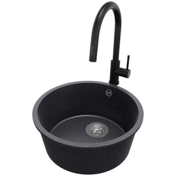 PRIMAGRAN Unterbauspüle Granit Anthrazit 46x46cm, Spülbecken 1 Becken + Küchenarmatur 40x20cm + Ablauf-Set, Granitspüle ab 50er Unterschrank - Valletta