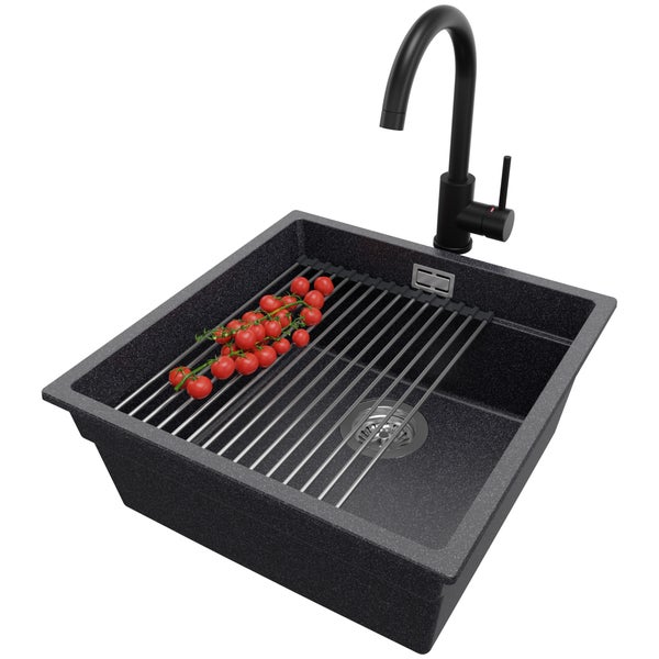 PRIMAGRAN Unterbauspüle Granit Anthrazit 46x47cm, Spülbecken 1 Becken + Küchenarmatur 32x20cm + Ablauf-Set + Aufrollbare Abtropffläche, Granitspüle ab 50er Unterschrank - Praga