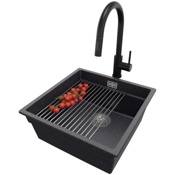 PRIMAGRAN Unterbauspüle Granit Anthrazit 46x47cm, Spülbecken 1 Becken + Küchenarmatur 40x20cm + Ablauf-Set + Aufrollbare Abtropffläche, Granitspüle ab 50er Unterschrank - Praga