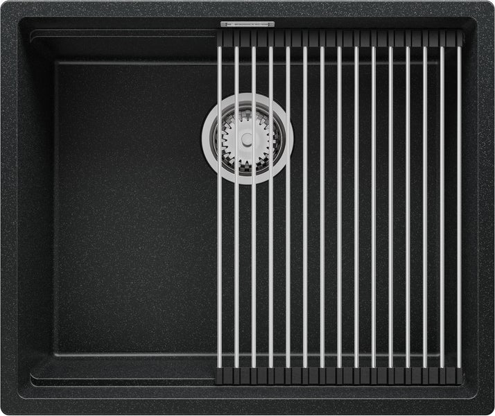 PRIMAGRAN Unterbauspüle Granit Anthrazit 56x47cm, Spülbecken 1 Becken + Ablauf-Set + Aufrollbare Abtropffläche, Granitspüle ab 60er Unterschrank - Praga
