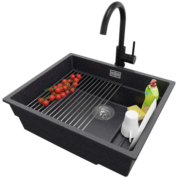 PRIMAGRAN Unterbauspüle Granit Anthrazit 56x47cm, Spülbecken 1 Becken + Küchenarmatur 32x20cm + Ablauf-Set + Aufrollbare Abtropffläche, Granitspüle ab 60er Unterschrank - Praga