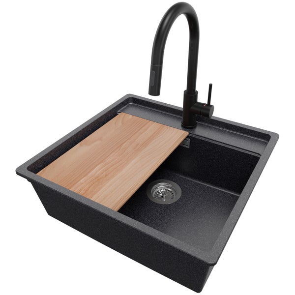 PRIMAGRAN Unterbauspüle Granit Anthrazit 56x53cm, Spülbecken 1 Becken + Küchenarmatur 40x20cm + Ablauf-Set + Schneidebrett, Granitspüle ab 60er Unterschrank - Bergen