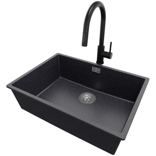 PRIMAGRAN Unterbauspüle Granit Anthrazit 66x47cm, Spülbecken 1 Becken + Küchenarmatur 40x20cm + Ablauf-Set, Granitspüle ab 70er Unterschrank - London