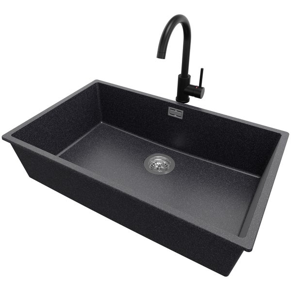 PRIMAGRAN Unterbauspüle Granit Anthrazit 76x47cm, Spülbecken 1 Becken + Küchenarmatur 32x20cm + Ablauf-Set, Granitspüle ab 80er Unterschrank - London