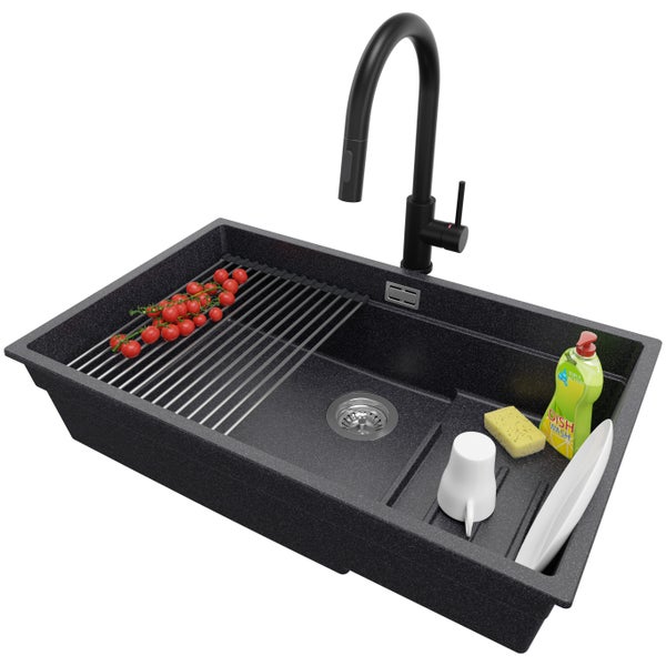 PRIMAGRAN Unterbauspüle Granit Anthrazit 76x47cm, Spülbecken 1 Becken + Küchenarmatur 40x20cm + Ablauf-Set + Aufrollbare Abtropffläche, Granitspüle ab 80er Unterschrank - Praga