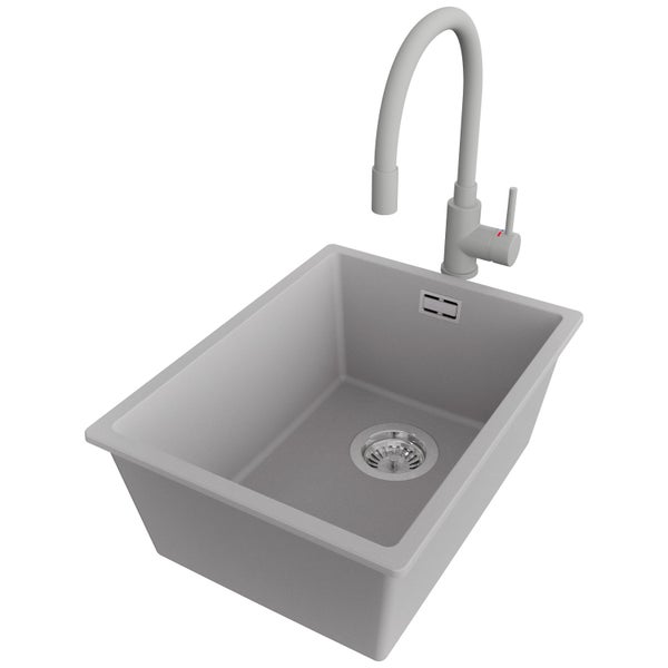 PRIMAGRAN Unterbauspüle Granit Grau 36x47cm, Spülbecken 1 Becken + Küchenarmatur 38x14cm + Ablauf-Set, Granitspüle ab 40er Unterschrank - London