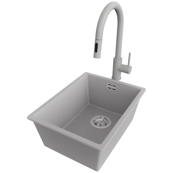 PRIMAGRAN Unterbauspüle Granit Grau 36x47cm, Spülbecken 1 Becken + Küchenarmatur 40x20cm + Ablauf-Set, Granitspüle ab 40er Unterschrank - London