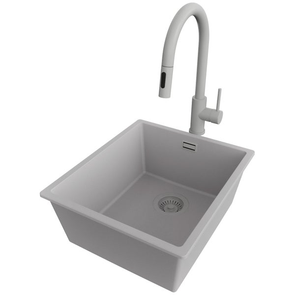 PRIMAGRAN Unterbauspüle Granit Grau 41x47cm, Spülbecken 1 Becken + Küchenarmatur 40x20cm + Ablauf-Set, Granitspüle ab 45er Unterschrank - London