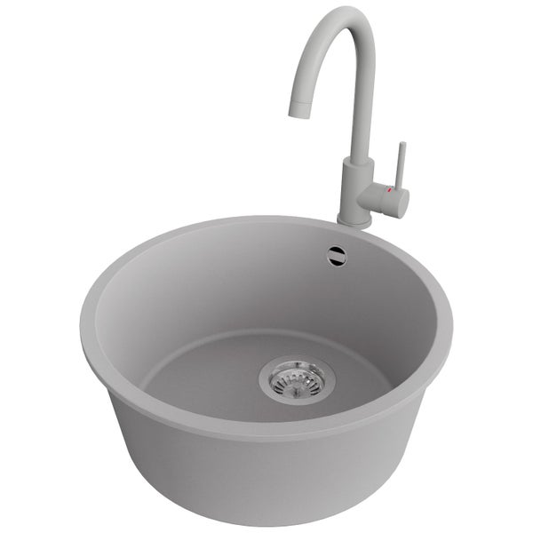 PRIMAGRAN Unterbauspüle Granit Grau 46x46cm, Spülbecken 1 Becken + Küchenarmatur 32x20cm + Ablauf-Set, Granitspüle ab 50er Unterschrank - Valletta