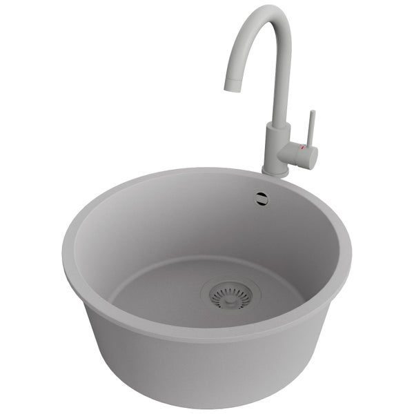 PRIMAGRAN Unterbauspüle Granit Grau 46x46cm, Spülbecken 1 Becken + Küchenarmatur 32x20cm + Ablauf-Set, Granitspüle ab 50er Unterschrank - Valletta