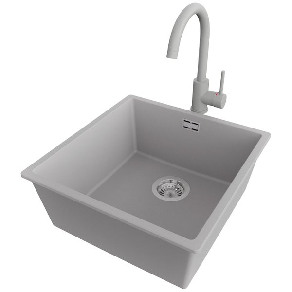 PRIMAGRAN Unterbauspüle Granit Grau 46x47cm, Spülbecken 1 Becken + Küchenarmatur 32x20cm + Ablauf-Set, Granitspüle ab 50er Unterschrank - London