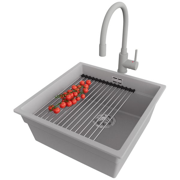 PRIMAGRAN Unterbauspüle Granit Grau 46x47cm, Spülbecken 1 Becken + Küchenarmatur 38x14cm + Ablauf-Set + Aufrollbare Abtropffläche, Granitspüle ab 50er Unterschrank - Praga