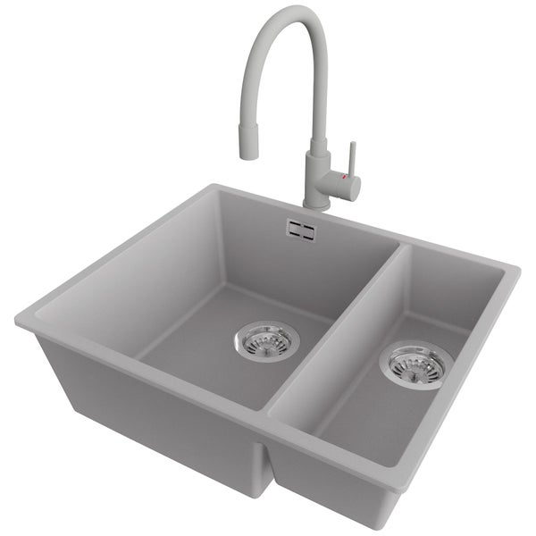 PRIMAGRAN Unterbauspüle Granit Grau 56x47cm, Spülbecken 1,5 Becken + Küchenarmatur 38x14cm + Ablauf-Set, Granitspüle ab 60er Unterschrank - London Duo