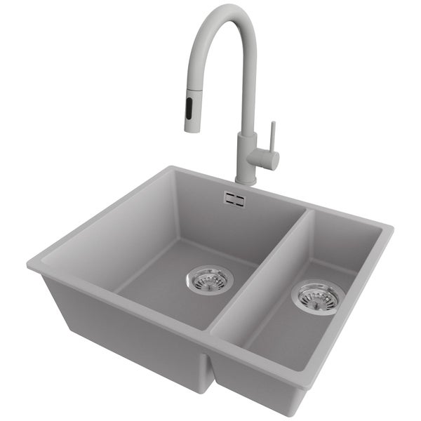 PRIMAGRAN Unterbauspüle Granit Grau 56x47cm, Spülbecken 1,5 Becken + Küchenarmatur 40x20cm + Ablauf-Set, Granitspüle ab 60er Unterschrank - London Duo