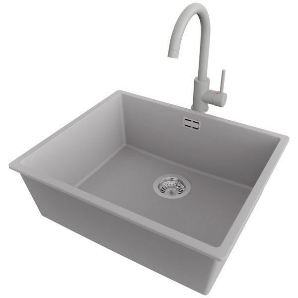 PRIMAGRAN Unterbauspüle Granit Grau 56x47cm, Spülbecken 1 Becken + Küchenarmatur 32x20cm + Ablauf-Set, Granitspüle ab 60er Unterschrank - London