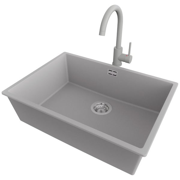 PRIMAGRAN Unterbauspüle Granit Grau 66x47cm, Spülbecken 1 Becken + Küchenarmatur 32x20cm + Ablauf-Set, Granitspüle ab 70er Unterschrank - London
