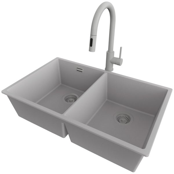 PRIMAGRAN Unterbauspüle Granit Grau 76x47cm, Spülbecken 2 Becken + Küchenarmatur 40x20cm + Ablauf-Set, Granitspüle ab 80er Unterschrank - London Twin