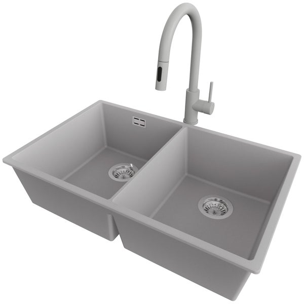 PRIMAGRAN Unterbauspüle Granit Grau 76x47cm, Spülbecken 2 Becken + Küchenarmatur 40x20cm + Ablauf-Set, Granitspüle ab 80er Unterschrank - London Twin
