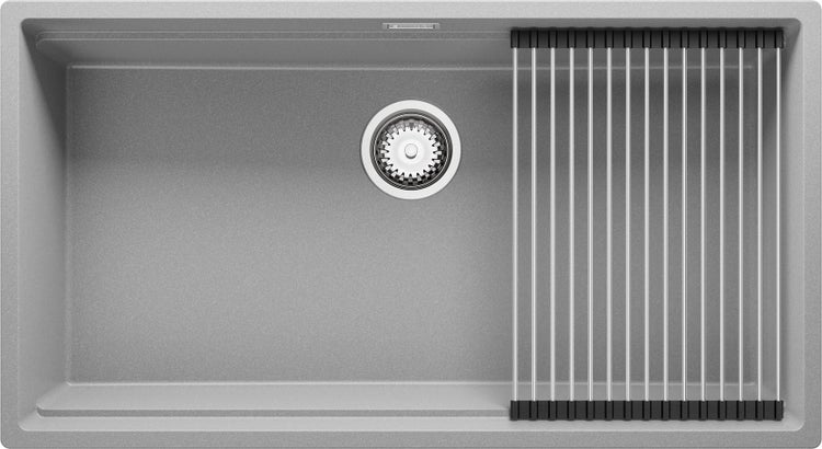 PRIMAGRAN Unterbauspüle Granit Grau 86x47cm, Spülbecken 1 Becken + Ablauf-Set + Aufrollbare Abtropffläche, Granitspüle ab 90er Unterschrank - Praga