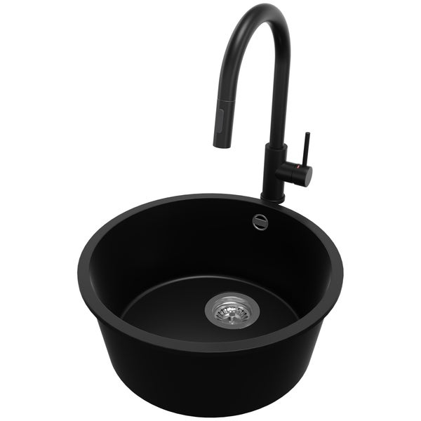 PRIMAGRAN Unterbauspüle Granit Schwarz 46x46cm, Spülbecken 1 Becken + Küchenarmatur 40x20cm + Ablauf-Set, Granitspüle ab 50er Unterschrank - Valletta
