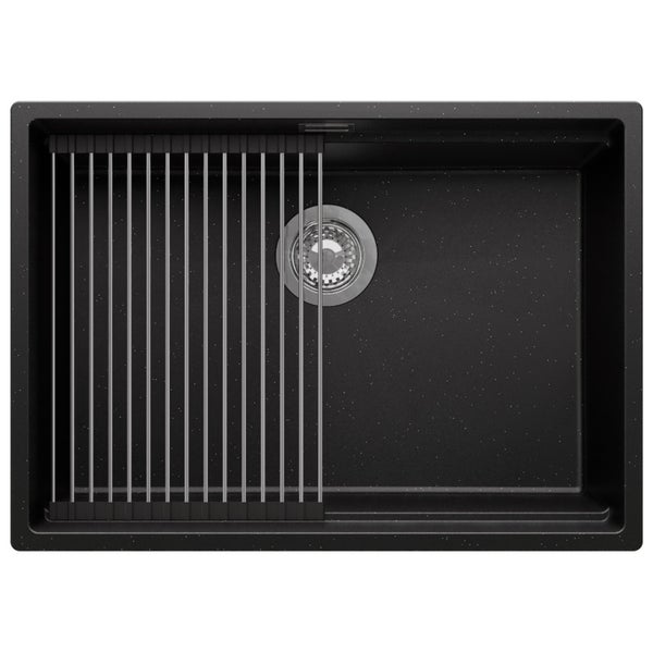PRIMAGRAN Unterbauspüle Granit Schwarz Metallic 66x47cm, Spülbecken 1 Becken + Ablauf-Set + Aufrollbare Abtropffläche, Granitspüle ab 70er Unterschrank - Praga