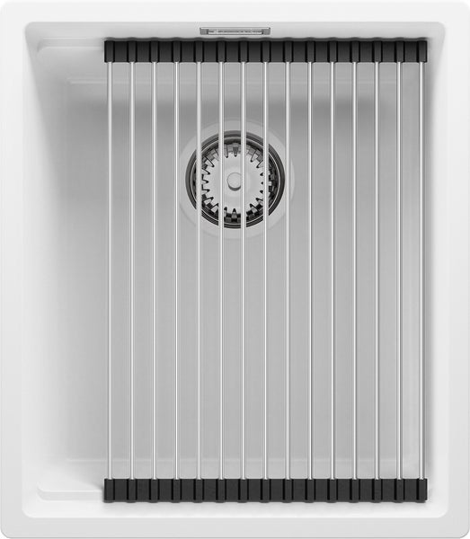 PRIMAGRAN Unterbauspüle Granit Weiß 41x47cm, Spülbecken 1 Becken + Ablauf-Set + Aufrollbare Abtropffläche, Granitspüle ab 45er Unterschrank - Praga