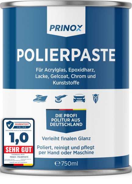 UNIVERSELLER EINSATZ - Prinox Polierpaste ist universell anwendbar für eine Vielzahl an Oberflächen wie Acrylglas, Epoxidharz, Lacke, Gelcoat gfk, Chrom & Kunststoffe. Materialschonend, hautfreundlich & giftfrei verleiht Sie jeder Oberfläche den finalen Glanz.,HERGESTELLT IN DEUTSCHLAND - Unsere Polierpaste wird in Deutschland hergestellt und abgefüllt. So garantieren wir dass nur die besten Inhaltsstoffe verwendet werden und Sie bei der Produktion den gewohnten hohen deutschen Qualitätsstandards entspricht!,BESTE EIGENSCHAFTEN - Je nach Oberfläche reicht eine Dose für 100m² bis 150m² - Durch feinste Polierkörper und hochqualitative Inhaltsstoffe entfernt Sie nicht nur Mattierungen und Mikro Kratzer, sondern wirkt auch schonend und verleiht einen schützenden Abperl-Effekt der die Oberfläche nachhaltig pflegt.,PRINOX ZUFRIEDENHEITSGARANTIE - Prinox steht für höchste Qualität. Mit weniger geben wir uns nicht zufrieden. Daher erhalten Sie auf jedes unserer Produkte eine lebenslange Rückgabe Garantie. Sollten Sie mit unseren Produkten nicht zufrieden sein kontaktieren Sie uns einfach und wir finden innerhalb von 24h eine Lösung für Sie.