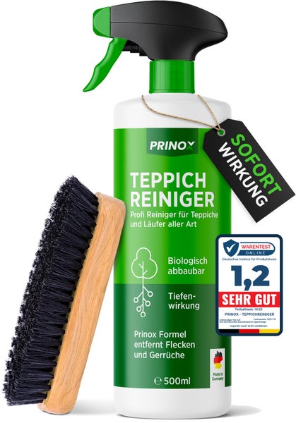 PRINOX® Profi Teppichreiniger 500ml - Teppichboden Reiniger inkl. Teppich Bürste, schäumend für alle Teppiche - Teppich Reinigungsmittel & Fleckenentferner aus Deutschland