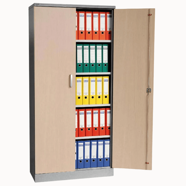Der Aktenschrank ist komplett aus Metall gefertigt und wurde zusätzlich mit ansprechenden Holztüren ausgestattet. Die Produkte der Beetle Serie sind sind sowohl für den privaten als auch für den gewerblichen Einsatz bestens geeignet. Die Oberflächen sind aus elektrostatisch pulverbeschichtetem Metall hergestellt und dadurch besonders robust. Die vier Fachböden sind frei verstellbar. Bei gleichmäßig verteilter Last, beträgt die Traglast pro Ebene 45 kg. So bietet der Metallschrank auf insgesamt fünf Ordnerhöhen reichlich Stauraum. Der Schrank ist zusätzlich abschließbar und es werden zwei Schlüssel mitgeliefert.