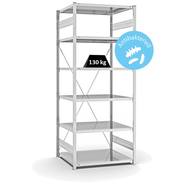 PROREGAL Antibakterielles Fachbodenregal Stecksystem T-Profil HxBxT 250 x 100 x 80 cm 6 Ebenen Traglast 130 kg Antibakterielle Beschichtung Weiß