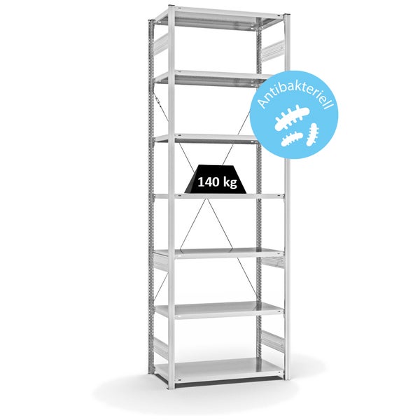 PROREGAL Antibakterielles Fachbodenregal Stecksystem T-Profil HxBxT 300 x 100 x 50 cm 7 Ebenen Traglast 140 kg Antibakterielle Beschichtung Weiß