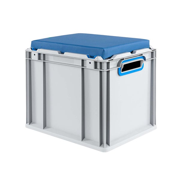-Robuste SeatBox in Euronorm: die Eurobox in Grau ist aus stabilem Kunststoff Polypropylen (PP) hergestellt und mit einem weich gepolsterten und abnehmbaren Sitzkissen ausgestattet.