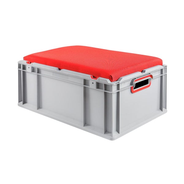 -Robuste SeatBox in Euronorm: die Eurobox in Grau ist aus stabilem Kunststoff Polypropylen (PP) hergestellt und mit einem weich gepolsterten und abnehmbaren Sitzkissen ausgestattet.