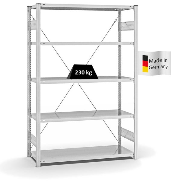 PROREGAL Fachbodenregal Stecksystem T-Profil Medium-Duty Grundregal HxBxT 200 x 130 x 50 cm 5 Ebenen Fachlast 230 kg Einseitig Nutzbar Lichtgrau