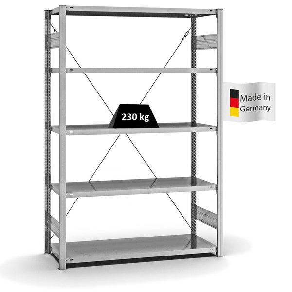 PROREGAL Fachbodenregal Stecksystem T-Profil Medium-Duty Grundregal HxBxT 200 x 130 x 50 cm 5 Ebenen Fachlast 230 kg Einseitig Nutzbar Verzinkt
