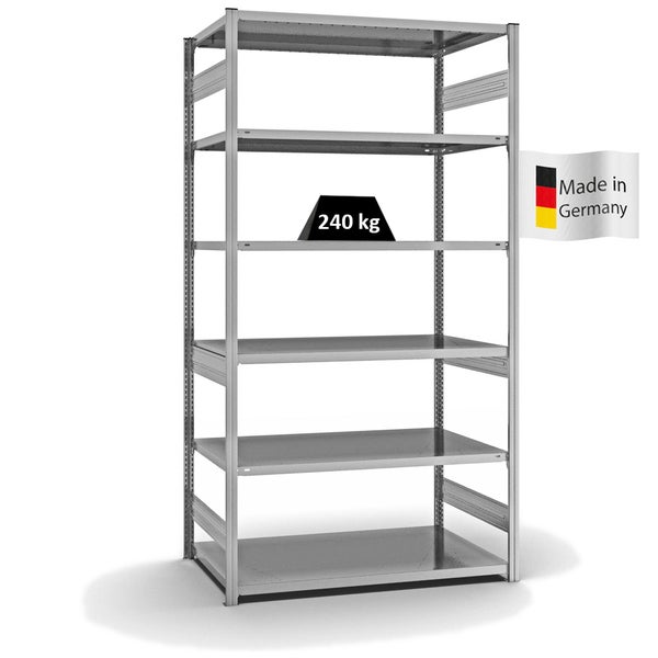 PROREGAL Fachbodenregal Stecksystem T-Profil Medium-Duty Grundregal HxBxT 250 x 130 x 80 cm 6 Ebenen Fachlast 240 kg Beidseitig Nutzbar Verzinkt