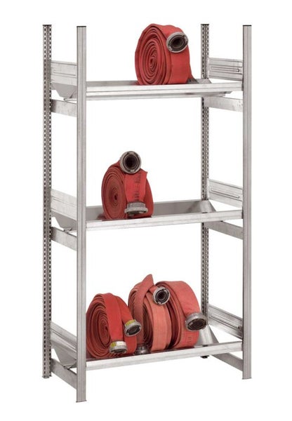 Das Schlauchregal ist ein spezielles Regal zur Aufbewahrung von Feuerwehrschläuchen oder Schläuchen des THWs. Für die Langlebigkeit der teuren Schläuche, sorgt die spezielle Form der Lagerebenen. Hier werden die Schläuche knickfrei gelagert. Durch die hohe Traglast von 100 kg pro Ebene kann das Regal auch gut bestückt werden. Die speziellen Lagerebenen verfügen über eine Ablaufrinne. Das eventuell vorhandene Restwasser kann so ungehindert abfließen.