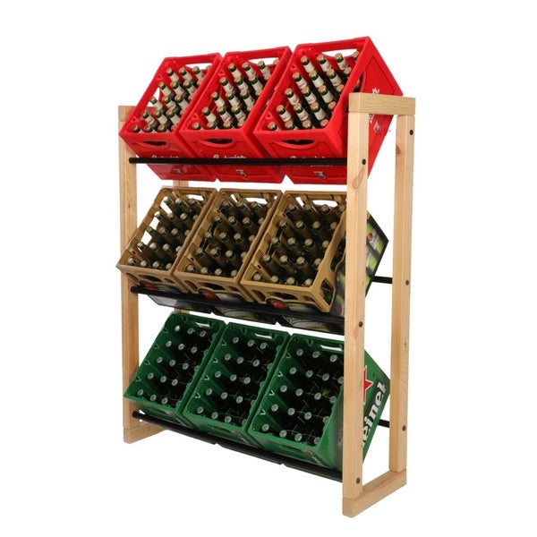 Mit einer Tiefe von 32 cm und einer Breite von 82 oder 112 cm für jeweils 2 oder 3 Kisten pro Ebene passt es ideal in viele verschiedene Räume und sorgt für eine aufgeräumte, übersichtliche Lagerung deiner Kisten. Nicht nur Getränkekisten finden hier Platz – auch die Lagerung von Universalboxen, Gemüsekisten, Euroboxen und Leergutbehältern ist problemlos möglich. Durch die Schräglage der Getränkekisten ist eine ergonomische Entnahme von Flaschen möglich und das Umstapeln von Getränke- oder Weinkisten gehört der Vergangenheit an.