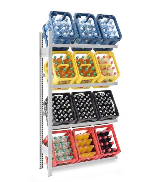 Auch im Getränkemarkt, zum Beispiel für das Pfandgut, lassen sich diese Regale einsetzen. Mit den drei Breiten von 50 cm, 75 cm oder 100 cm können die Getränkekistenregale von mindestens 3 bis 9 Kästen lagern. Lieferbar sind diese praktischen Regale in den Ausführungen verzinkt oder verzinkt und zusätzlich kunststoffbeschichtet in RAL 7035 lichtgrau. Mit der hohen Traglast von 100 kg sind diese Regale so gut wie unverwüstlich. Für das heimische Getränkelager in der Abstellkammer oder im Keller sind die Regale auch mit Weinflaschenregalen von PROREGAL kombinierbar.