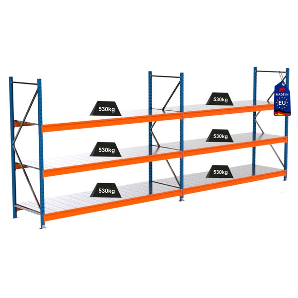 PROREGAL Industrie Weitspannregal Lagerregal MAXIMUS PRO Komplettregal: 2 Felder HxBxT 200x500x80cm 3 Ebenen, Stahlplatten-Fachboden, Fachlast 530 kg Blau/Orange