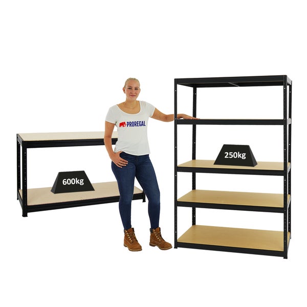 PROREGAL Mega Deal 1x Schwerlastregal Big Elephant M HxBxT 180 x 120 x 60 cm & 1x Höhenverstellbare Werkbank Big Dino HxBxT 90 x 160 x 60 cm Schwarz