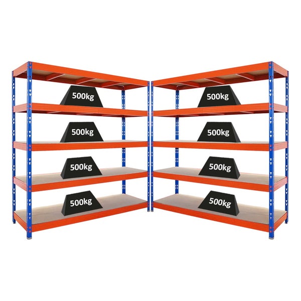 PROREGAL Mega Deal 2x Profi Schwerlastregal Rhino HxBxT 200x200x60cm 5 Spanplatten-Ebenen 8mm Fachlast 500kg Blau/Orange