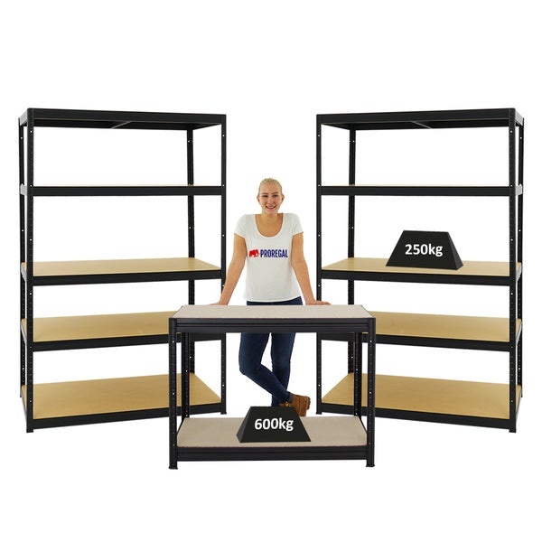 PROREGAL Mega Deal 2x Schwerlastregal Big Elephant M HxBxT 180 x 120 x 60 cm & 1x Höhenverstellbare Werkbank Slim Dino HxBxT 90 x 120 x 60 cm Schwarz