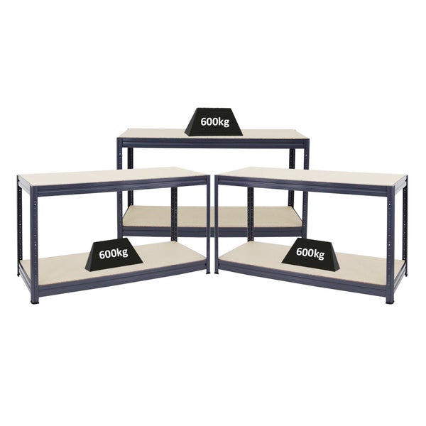 Die Werkbänke sind mittels eines Stecksystems ohne Werkzeug einfach und schnell aufzubauen. Pro Werkbank haben beiden Fachböden eine Stärke von 12 mm und sind in der Lage ein Gewicht von jeweils 600 kg zu tragen. Die Ebenen lassen sich in 50 mm Abständen in der Höhe verstellen.