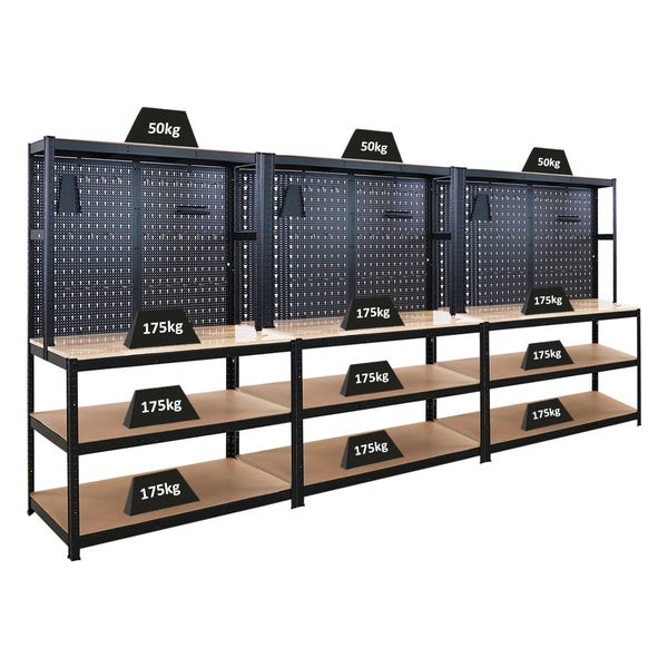 Außerdem verfügt jede Werkbank über 3 Fachböden aus hochwertigem MDF-Platten mit einer Bodenstärke von 5 mm, die dank des Höhenrasters in 2,5 cm Abständen höhenverstellbar sind. Die 2 unteren Ebenen mit einer Tiefe von jeweils 60 cm bieten großzügigen Stauraum für schwere Werkzeuge oder Materialien. Der Deckboden mit einer Tiefe von 30 cm ist ideal für kleinere Werkzeuge oder als zusätzliche Ablagefläche. Mithilfe von jeweils 2 Unterstreben bietet die Werkbank eine Traglast von 175 kg für die unteren Fachböden und 50 kg für den oberen Fachboden.