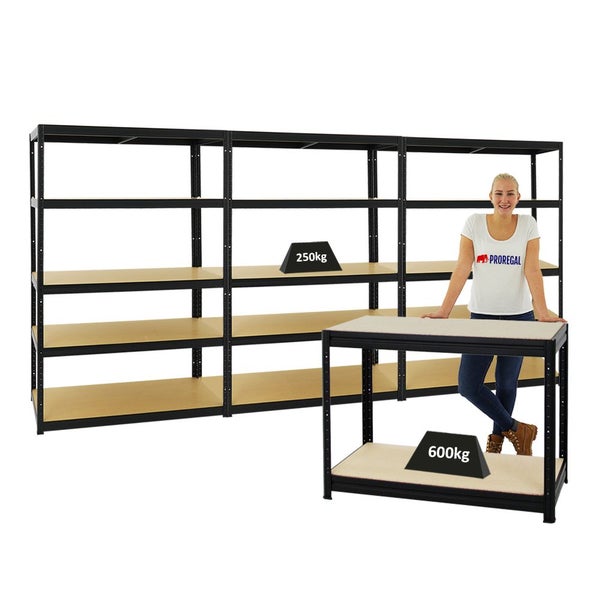 PROREGAL Mega Deal 3x Schwerlastregal Big Elephant M HxBxT 180 x 120 x 60 cm & 1x Höhenverstellbare Werkbank Slim Dino HxBxT 90 x 120 x 60 cm Schwarz