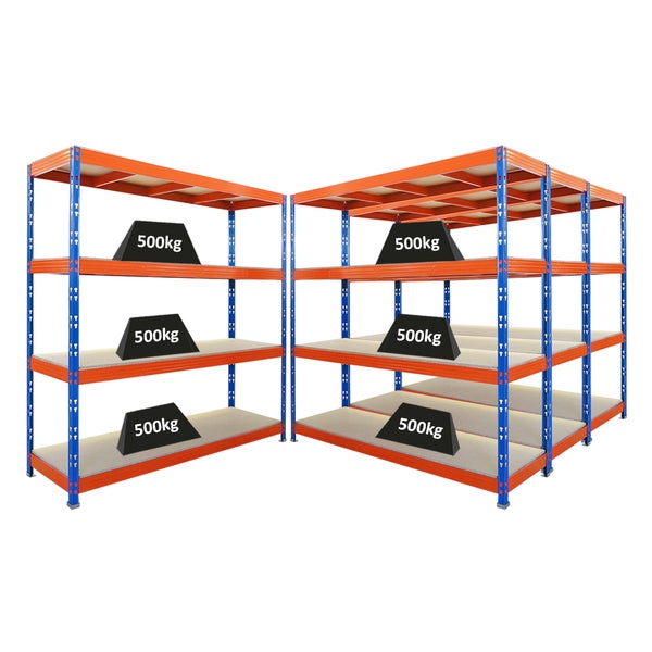 PROREGAL Mega Deal 4x Profi Schwerlastregal Rhino HxBxT 200x200x60cm 4 Spanplatten-Ebenen 16mm Fachlast 500kg Blau-Orange