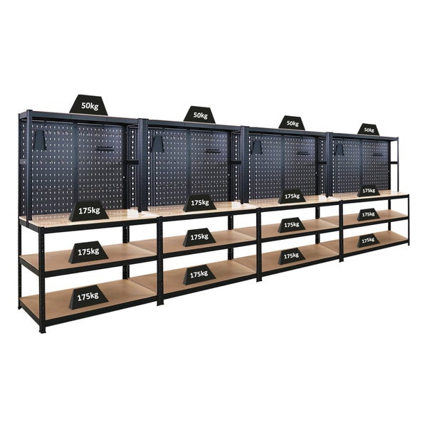 PROREGAL Mega Deal 4x Profi Werkbank GIANT BEAST mit Lochwand HxBxT 180x120x60cm Fachlast 175kg inkl. Werkzeughalter Set Schwarz Arbeitstisch