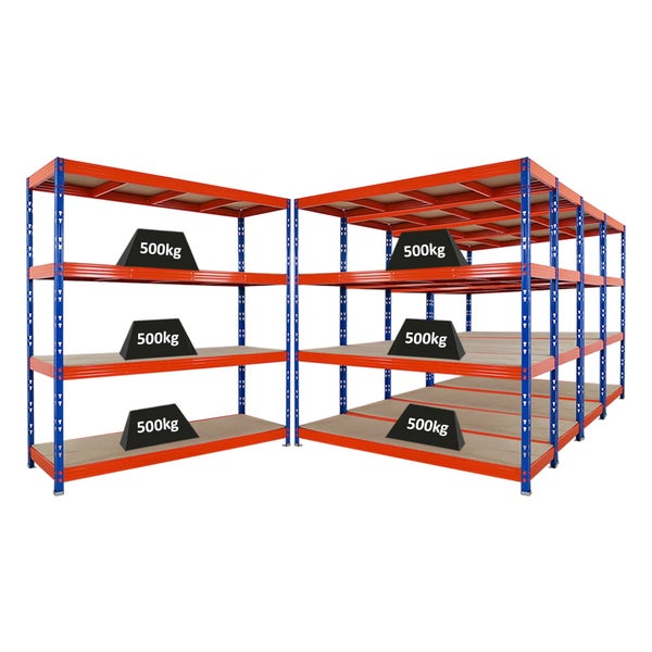 PROREGAL Mega Deal 5x Profi Schwerlastregal Rhino HxBxT 200x200x60cm 4 Spanplatten-Ebenen 8mm Fachlast 500kg Blau-Orange
